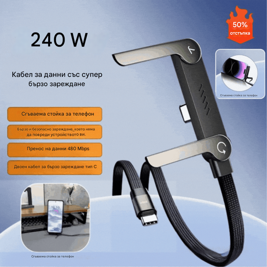 🔥Купете 1, вземете 1 безплатно!🔥⚡Кабел за бързо зареждане 2 в 1 с регулируем държач за телефон🔋