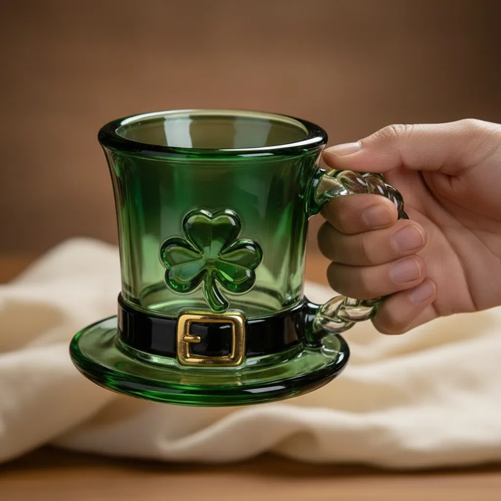 🔥【¡50% de descuento!】☕Taza de cristal con gorro de duendecillo y trébol de la suerte - Taza de café verde esmeralda