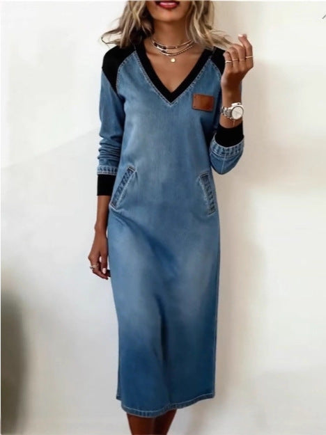 ✅Platba pri doručení 【50% zľava】【S-3XL】Nové módne džínsové šaty s farebnými blokmi a výstrihom do V