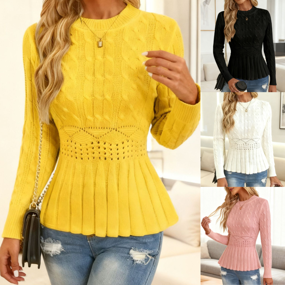 🔥Nový retro pletený sveter s okrúhlym výstrihom a dlhými rukávmi pre ženy - úzky pás, skladaný vrch